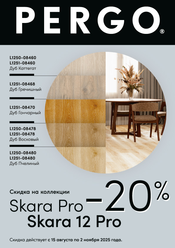 С 15 августа по 2 ноября интернет-магазин «УютПол» дарит уникальную возможность купить инновационный ламинат Pergo из новых коллекций Skara Pro и Skara Pro 12 со специальной скидкой 20%. Это ваш шанс приобрести премиальное напольное покрытие шведского качества по исключительной цене! Успейте преобразить свой интерьер с выгодой .